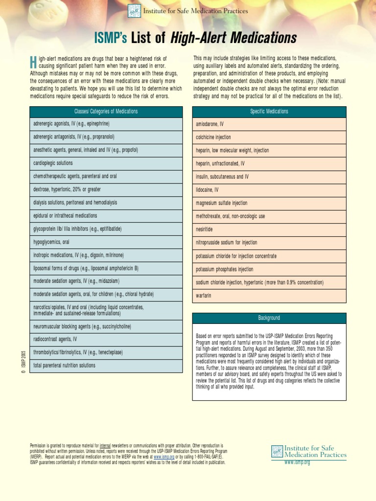 Identify best practice recommendations and organizational safeguards used to reduce risk with high alert medications 3. Similar findings were found in an ismp study, the 1996 benchmarking project, which culled data on serious medication errors from 161 health care organizations. This checklist can also be used during your new drug formulary review. Providers should evaluate whether these alternatives can be used in place of hrms for their patients. Standardizing the prescribing, storage, preparation, dispensing, and administration of these medications The list should be based on the organization's unique utilization patterns, its owninternal data about medication errors and sentinel events or near misses. High alert medications are drugs that bear a heightened risk of causing significant patient harm when they are used in error. Unauthorized distribution, copying or disclosure is prohibited. Be able to identify what a high alert medication is and what medications are considered high alert at nebraska medicine (nm) 2. Understand how to safely evaluate, order and monitor high risk medications 4. The institute for safe medication practices (ismp) reports that, although mistakes may not be more common in the use of these medications, when errors occur the impact on the. The safer treatment options provided represent potential alternatives to hrms. Drug class and medication selection and procurement storage ordering verifying and transcribing preparing or compounding administration monitoring.